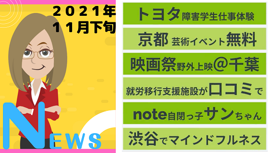 10分動画,ニュース,news,2021年,11月,下旬,エンカレッジ,トヨタ,仕事体験,文化庁,京都,コネクト,precog,印西,映画祭,ジョブレ, 就労移行,口コミ,note,サンちゃん,マンガ,メディトピア,マインドフルネス,メディテーション | |