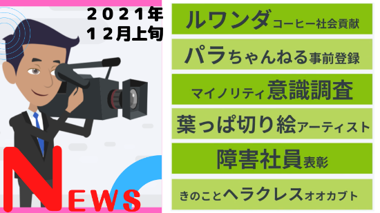 10分動画,ニュース,news,2021年,12月,上旬,就労継続⽀援,GROWTH FIELD,ヘラクレスオオカブト,CONNECTIT,葉っぱ切り絵,リト,ACE,障害者雇用,キャリアート,パラちゃんねる,Familic,Tobira Cafe,就労支援,日本財団,ダイバーシティ,インクルージョン,調査 | |