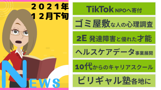 10分動画,ニュース,news,2021年,12月,下旬,tiktok,npo,寄付,ゴミ屋敷,発達障害,GoodService,えじそんくらぶ,2E,本,ACCELStars,東京大学,睡眠,SEKAISHA,キャリア,アカデミ,坪田塾,ビリギャル,受験 | |